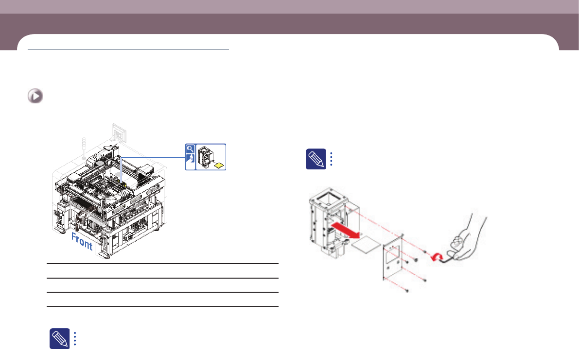 DE CAN S 2 Ma int en an ce H a nd bo o k 3-1 7 Chap ter 3 每日检查 Advanced Chip Shooter Fix Camera Lens 检查及清扫 清除沾在 Camera Lens 上的异物,可以防止元件识别错误。 维 护工 具 (+)起子 , 空气喷射器 措施 Step 1. 进 行 X Frame 的正 面 移 动。 详细内容请参阅 详见 "4. Front…