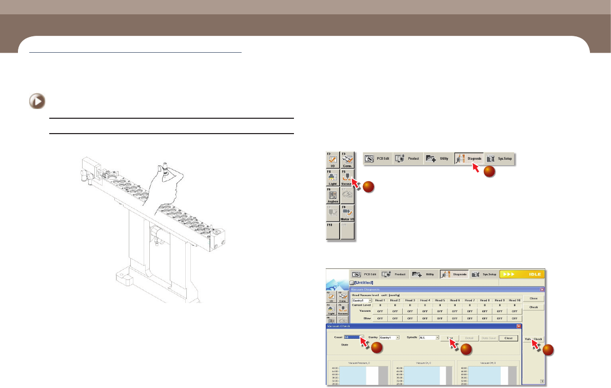 每周检查 Chap ter 4 Advanced Chip Shooter DE CAN S 2 Ma int en an ce H a nd bo o k 4-3 Solenoid Valve的检查 措施 Step 1. 在 ANC 上 插入 CN 0 4 0 吸嘴 Step 2. 设 备 起 动 后 、把 ANC 的 CN 0 4 0 吸嘴安装到贴装头 Step 3. 选择 MMI 的 " Diagnosis" …