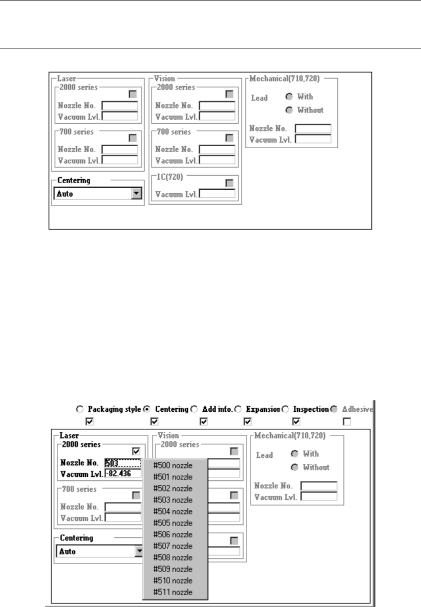 4 – 88 4.7.4 Tack control section (Centering page) Select “Laser” because this item is specif ic only to “Laser ”. No other center ing met hod cannot be selected. Note: When you read data fr om another m achine or databa…