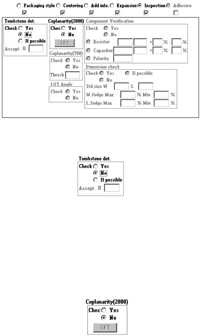 4 – 97 4.7.7 Tack control section (Inspection page) ① T ombstone det. Using the r adio button, select whether to use the chip r ise detecting opt ion. − W hen you select the radio but ton “Y es” or “ If possible,” ent er…