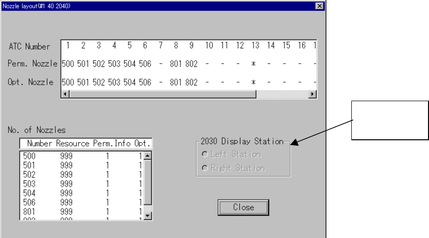 4 – 170 The f ollowing window displays after a stat ion is selected: Figure 4.10.3. 2 Nozzle Lay out Display Example • Perm. Nozzle (Permanent nozzle): Nozzle lay out which is set on the Machine setup menu. ( * mark indi…