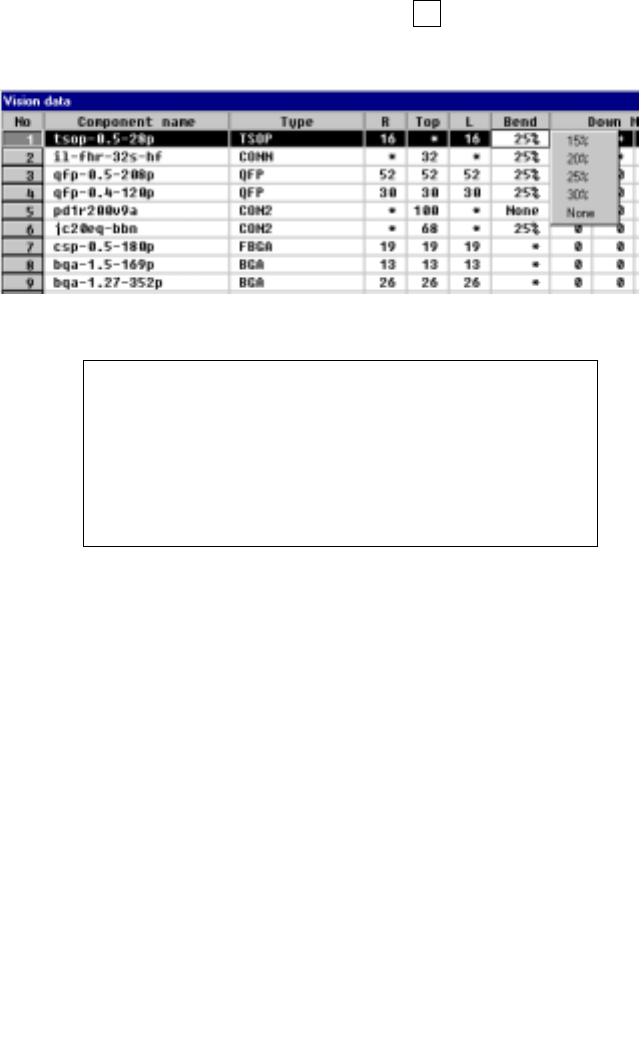 5 − 22 ⑨ Bend W hen t he machine detects a bent lead, it discards t he component having a bent lead onto the I C discard position as operat ion for an error . Ent er the level for det ecting a bent lead here. - W hen dat…