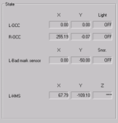 9 − 17 (4) S tate display Figure 9.2.3. 1 St ate display dialog box ① OCC The X and Y coordinates and O N and OFF setting of the light are displayed when the OCC is controlled com pletely . ② Bad m ark sensor The X and Y…