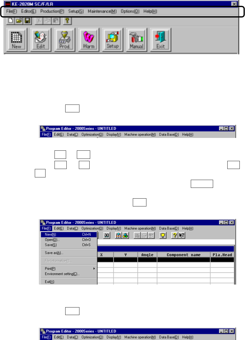 3 − 7 3.3.2 Selecting a menu There are t wo possible way s to select a pull- down menu from among t hose contained in the menu bar . (1) Usin g the cursor keys ① Press the Alt key to activate the menu bar . The [ File] m…