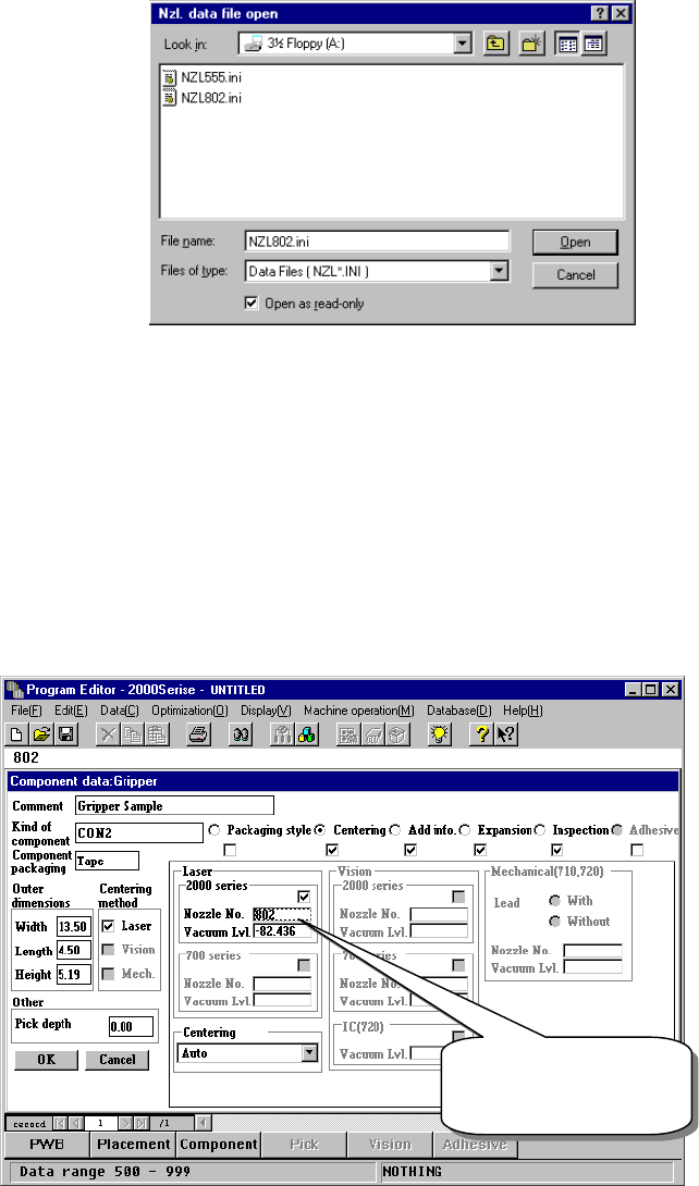 the Machine setup menu. The following “Nzl. data file open” dialog box