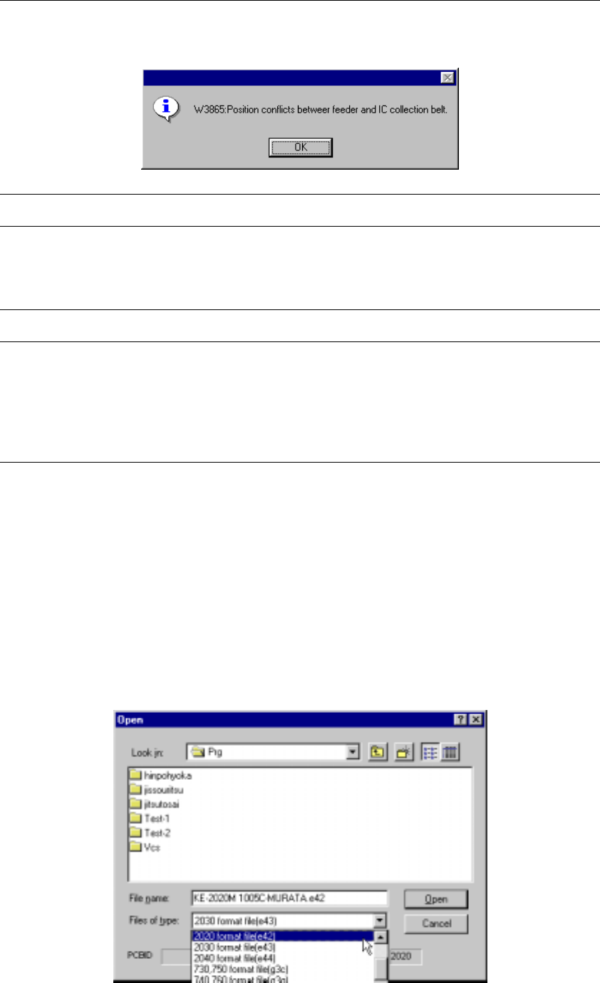 4 − 9 Note: When reading a file, the machine checks to see if a position specified in Pick data is overlapped with the IC collection belt position. If the machine detects any overlap, it displays the war ning message as …