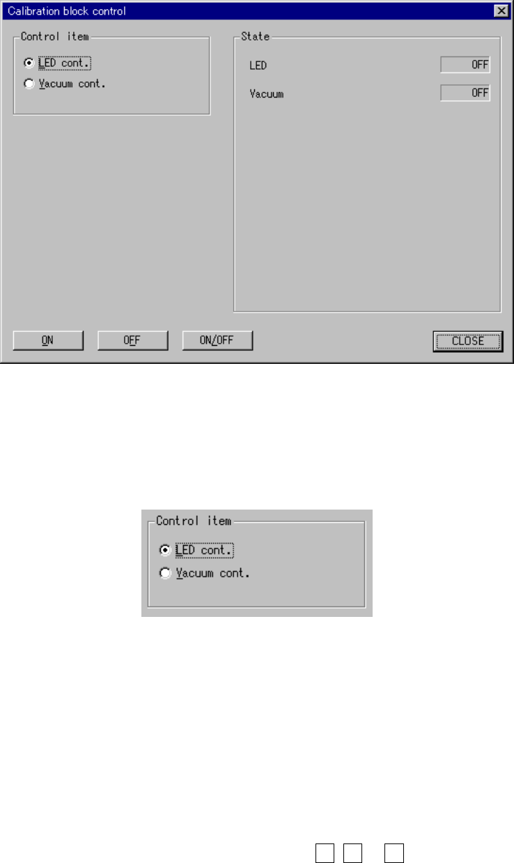 9 − 62 9.6.5 Calibration block control W hen you select the [Others] command on the [Ctrl] menu, then the [Calib ration block contr ol] comm and, the f ollowing “Calibration block contr ol” dialog box appears on the scre…