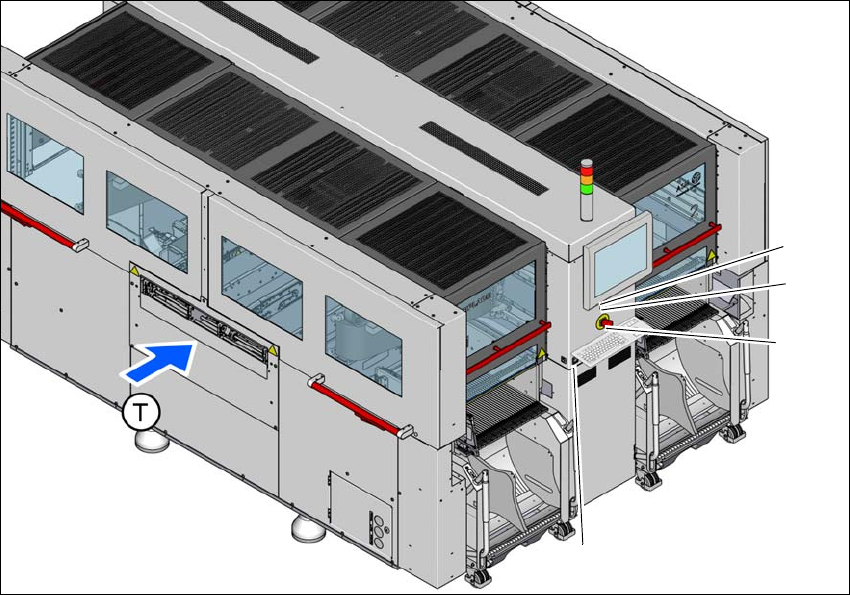 2 Betriebssicherheit Betriebsanleitung SIPLACE CA4 V2 2.6 Sicherheitseinrichtungen Ab Softwareversion 713.0 Ausgabe 12/2019 74 2.6.3 Schalter und T aster am Bestückautomaten 2.6.3.1 Lage von Schaltern und T astern am Bes…