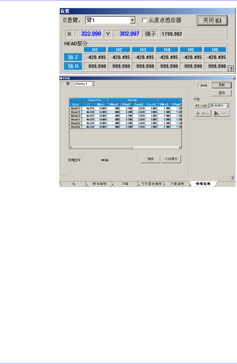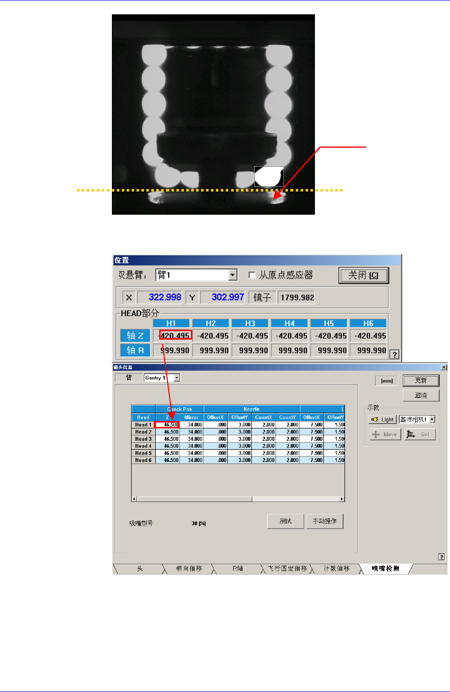 Machine Calibration 14-13 Z 轴高度的 示教 (Head Z T eaching) 默认值为 50.5 。 1. 在 View 菜单 选择 Current Position 执行“位置”。 2. 在 Nozzle Check TAP 对话框单击 < 手动操作 > 键,执行“手动控制”对 话框。 3. 在 Axis TAP 对话框的 < 轴 > 组合框选择 Z 。 4. 在 Camer…