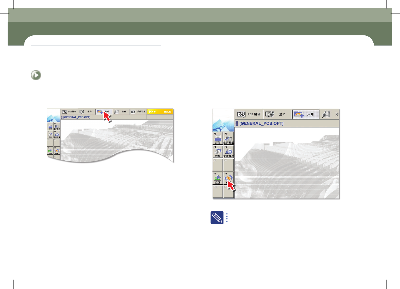 Chap ter 2 本 Chapter 主要介绍电源供应方法及生产开始前的检验事项。 电源供应及暖机 Advanced Chip Shooter DE CAN S 2 Op e rat io n Ha nd b oo k 2-5 生产前 准备 程序 > 预 机 (War min g-Up) 生产前准备程序 5. 预 机( Wa r m in g - Up ) Step 1. 选择 ' 应用 ' 菜 单:显 示…