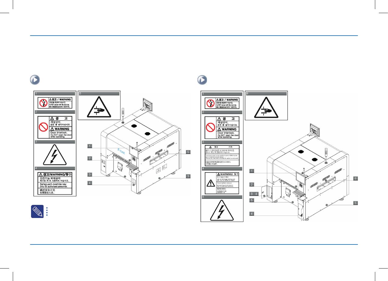 ※ 安全警告及注意事项 为了安全地使用设备 , 在下列位置粘贴了安全提示标签。 设备内部 安全提示标签的详细内容请参阅 Administrator' s Guide 。 ※ 安全装置( Safety Interlock )的动作 在紧急状况下立刻停止设备运转。 1. EMERGE NC Y 开关 2. Do or Lock 开关