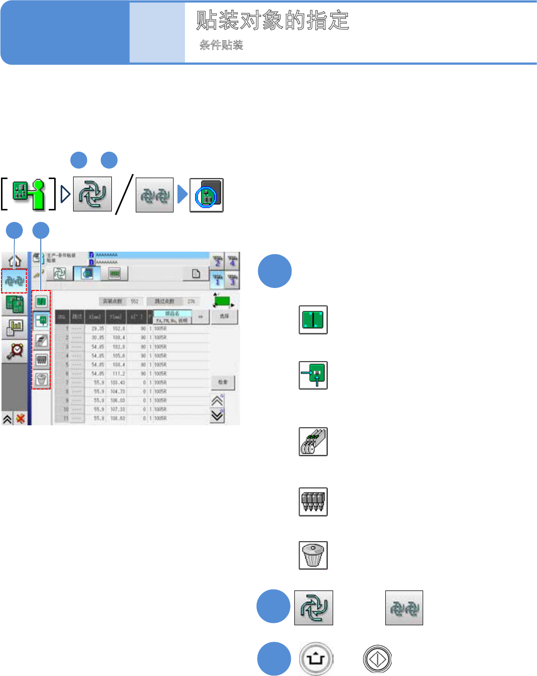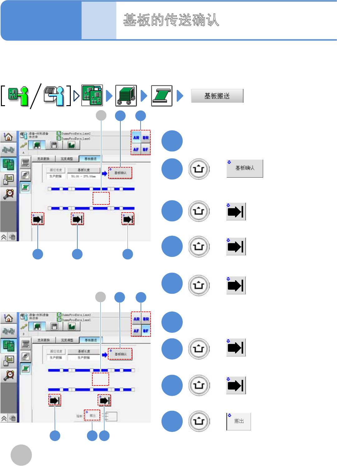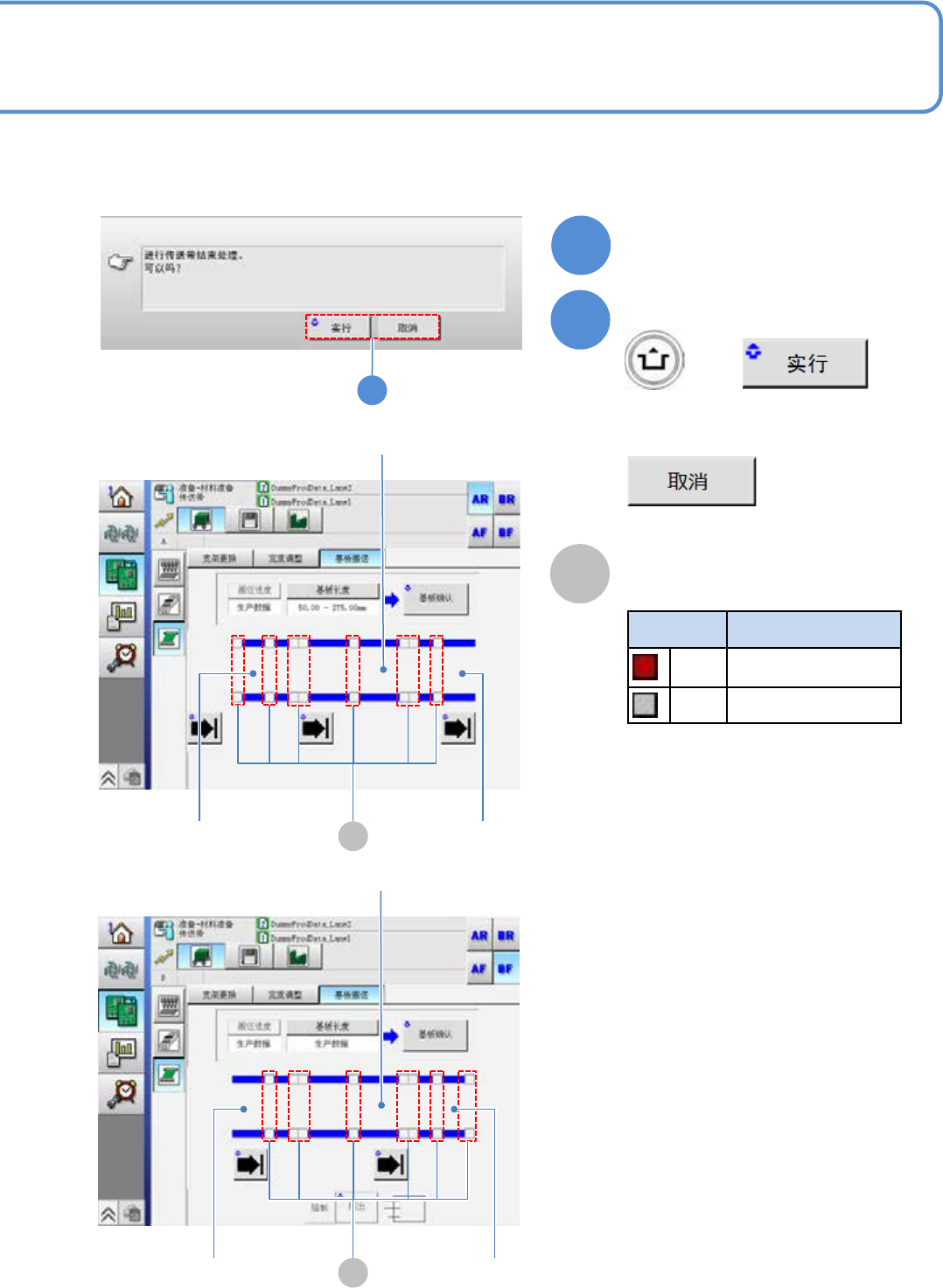 NPM - DX EJM8D C - MB - 03O - 00 3-3-5 -2 B 传感器 颜色 传感器的状态 红色 ON 灰色 OFF B 传入位置 贴装位置 基台之间的待机 位置 * 1) 此传感器 ,显示支 撑单元下降状态时 是否有基板 。 * 1) B 基台之间的待机 位置 贴装位置 传出位置 ∗ 本 页的操作画面 是以左→ 右流 向为例子的。 10 请按动接下去要进行的准备的操 作按钮 11 确认提示 + ( 会显示下一个…