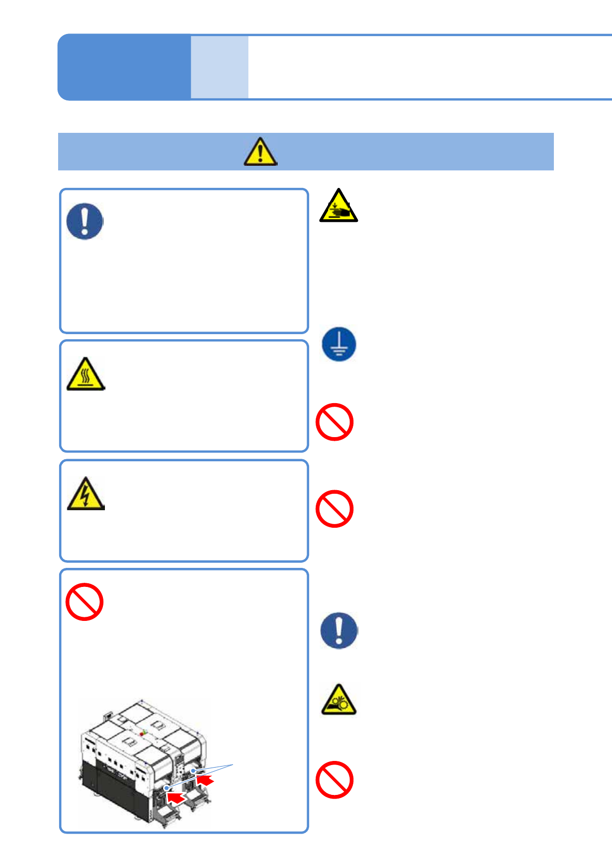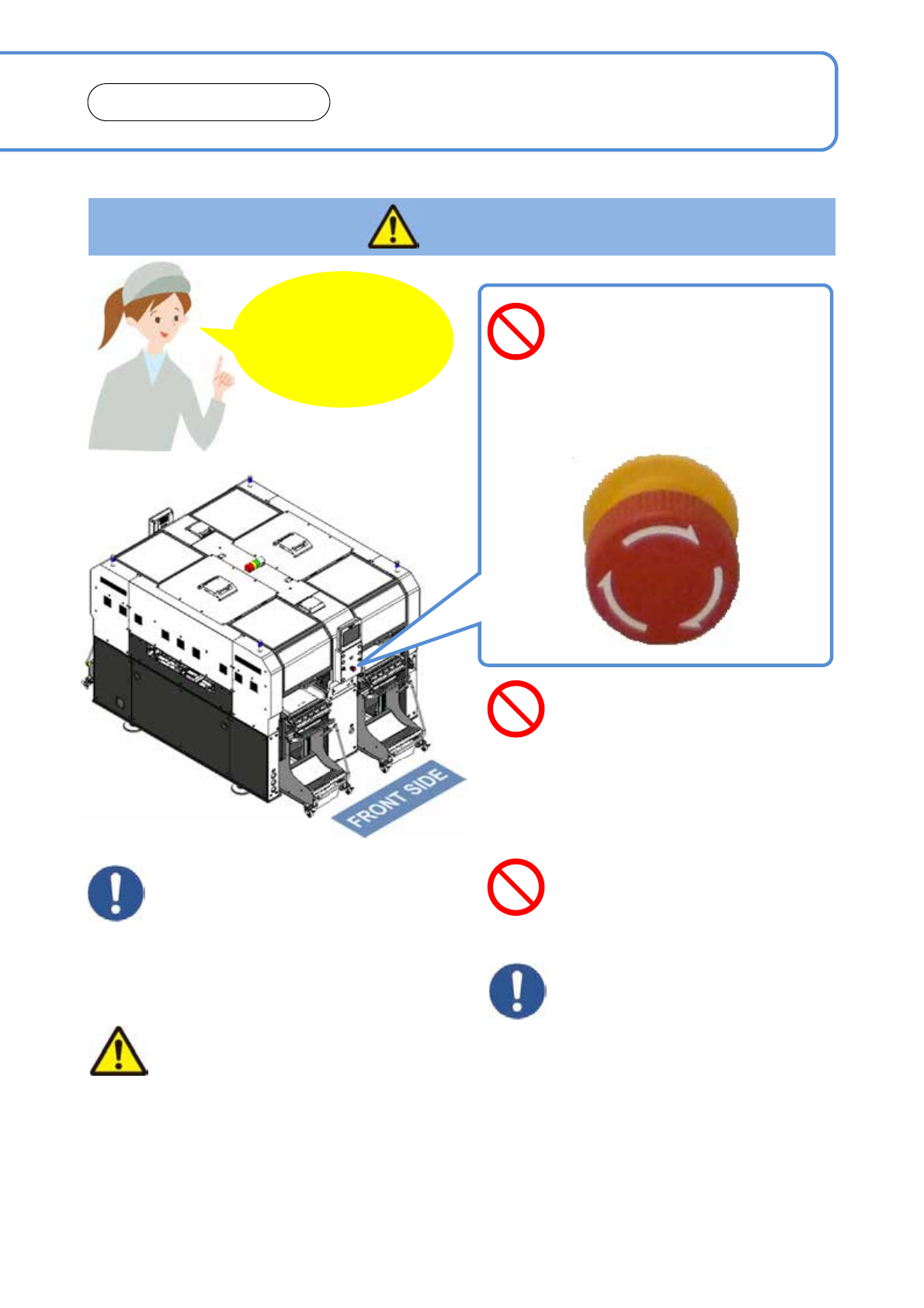 EJM8DC-SF-01C-0 1 NPM-DX 1-1 -7 警告 安全注意事项 4 1-1 未经专门培训者请勿 进行操作、调整、修 理 ( 错误操作、错误调整、错误修理可能造成 受伤 ) ●培训情况请与本公司联络。 小心高温 ( 可能烫伤 ) ●贴有此标记的警告标牌部分,可能 是高 温状态。 ●运转停止后,也有可能是高温状态 。 小心触电 ( 可能触电 ) ●贴有此标记的警告标牌部分,可能 会 有触电的危险。 请勿把手伸入供料器 搭…
