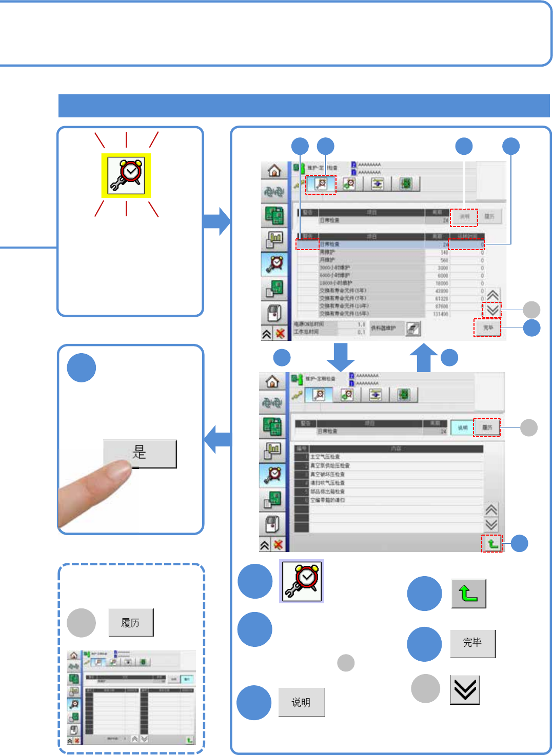 关于每隔560小时、1000小时、3000小时、6000小时以及18000小时的定期检查项目请参考工程师所用手册的