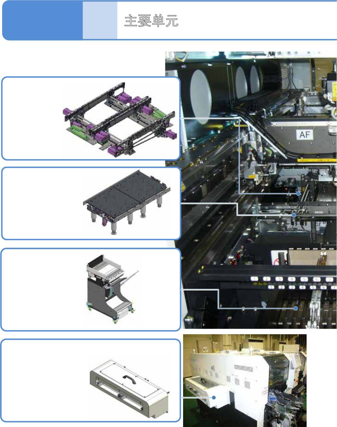 EJM8D C - SF - 02O - 00 NPM - DX 各部位 名称 主要 单元 通过基板支撑块 和支撑销, 支撑基板背面 。 1-6-3 -1 供给部 供给贴装元件。 1-6-3 基板支架 交换台车 延长传送带 是安装在生产线 的最前头 和最末尾的 NPM - DX 处, 确保开口部的 安全 的。 基板传送带 传入 、夹紧、传出基板。