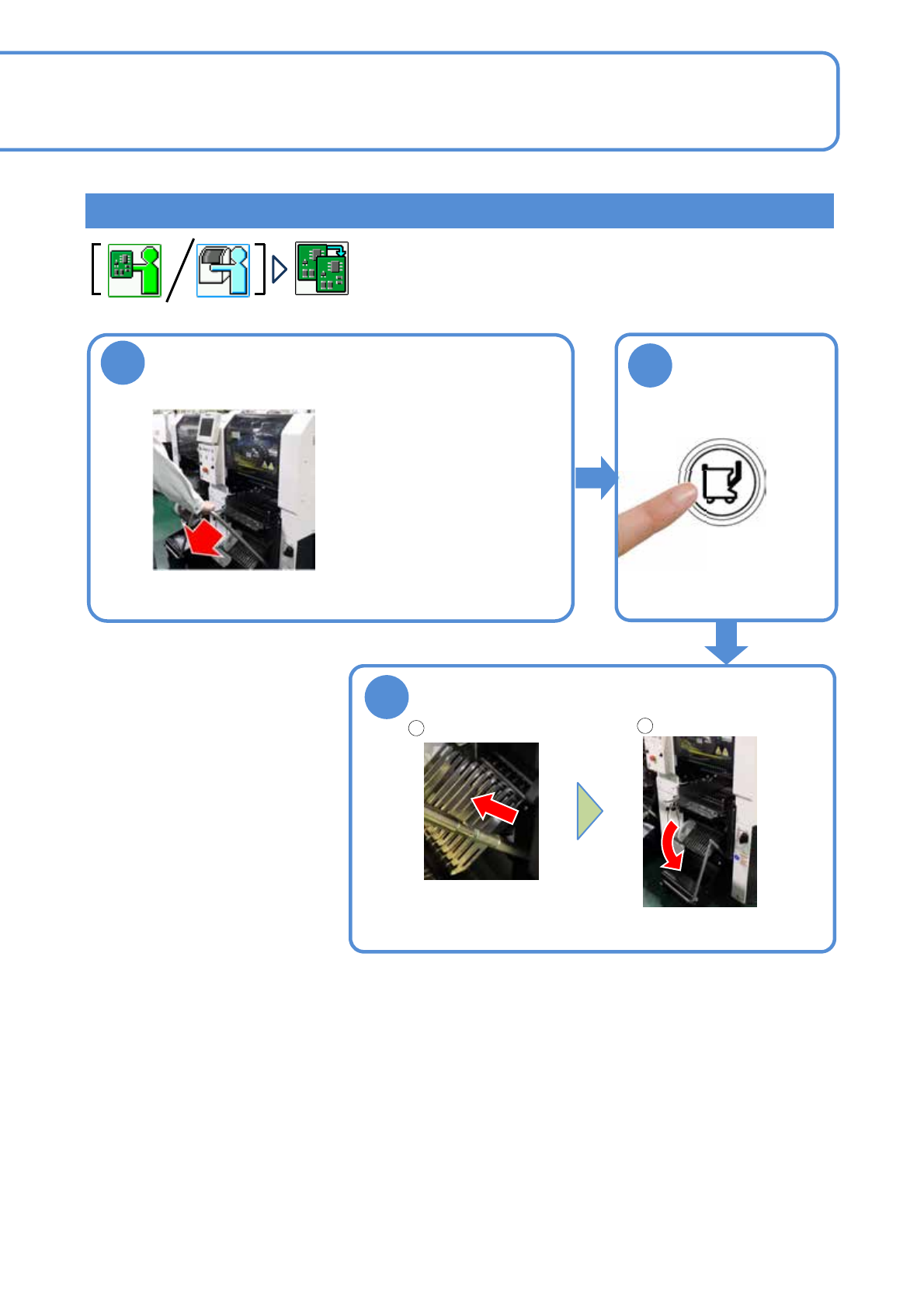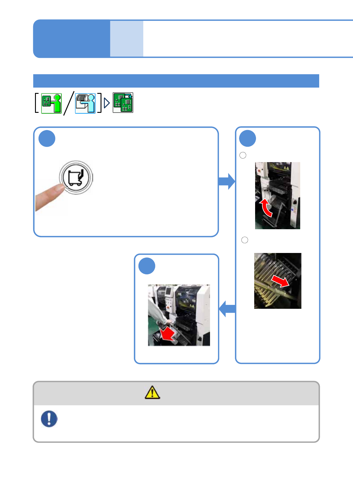 EJM8DC-MB-02C-0 1 NPM-DX 1 2 2-4 -2 安装方法 3 1 2 按 3 秒以上 ( 警报器响的同时,被固定在 主体设备中,信号灯从闪烁 变成亮灯。 ) 安装交换台车 ( 从亮灯变成闪烁,可以把交 换台车固定在主体设备中 ) ※设置时,请注意不要夹住 供料器用电源电缆。 提起管子 推回手柄 推回手柄 ※推回手柄时,请注意不要夹住供料 器用电源电缆。 ● 1 个