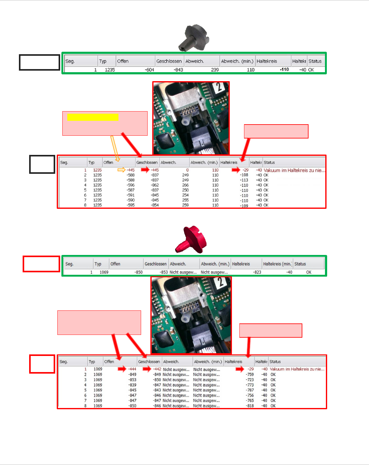 Serviceanlei tung Vakuumtest mit ges chlossenen Pi petten Seite 22 von 136 2.2.5 .3.3 Messung ohne Filterschei be. a.) mit Pipett en 1235 b.) mit Pipett en 1069 S OLL IST IST Keine Merkm ale Offen - W ert < S ol l Ges…