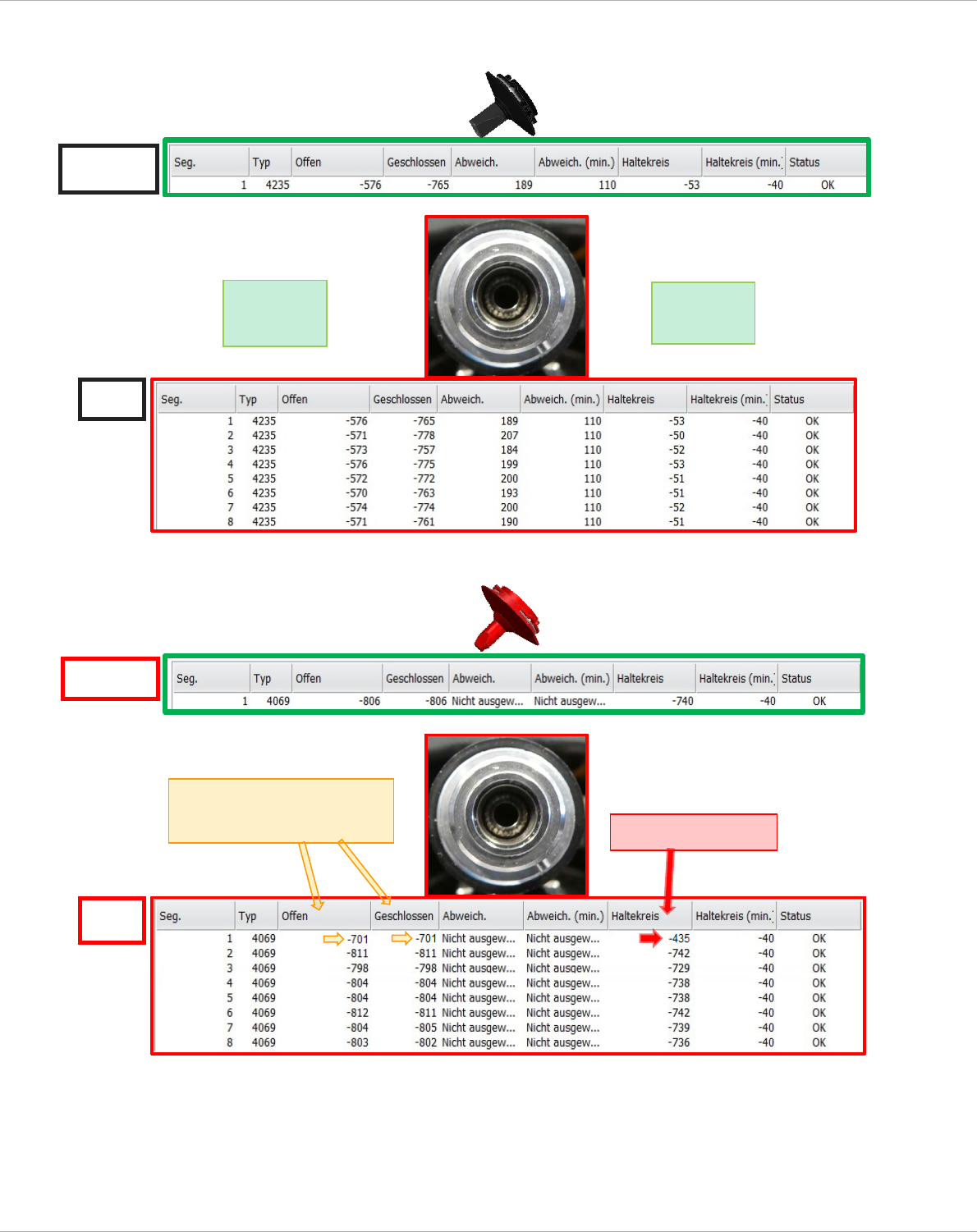 Serviceanlei tung Vakuumtest mit ges chlossenen Pi petten Seite 48 von 136 2.2.7 .3.3 Messung ohne Filterscheibe. a.) mit Pipett en 4 235 b.) mit Pipett en 4 069 S OLL IST IST Keine Merkm ale Offen - W ert < S ol l Ge…