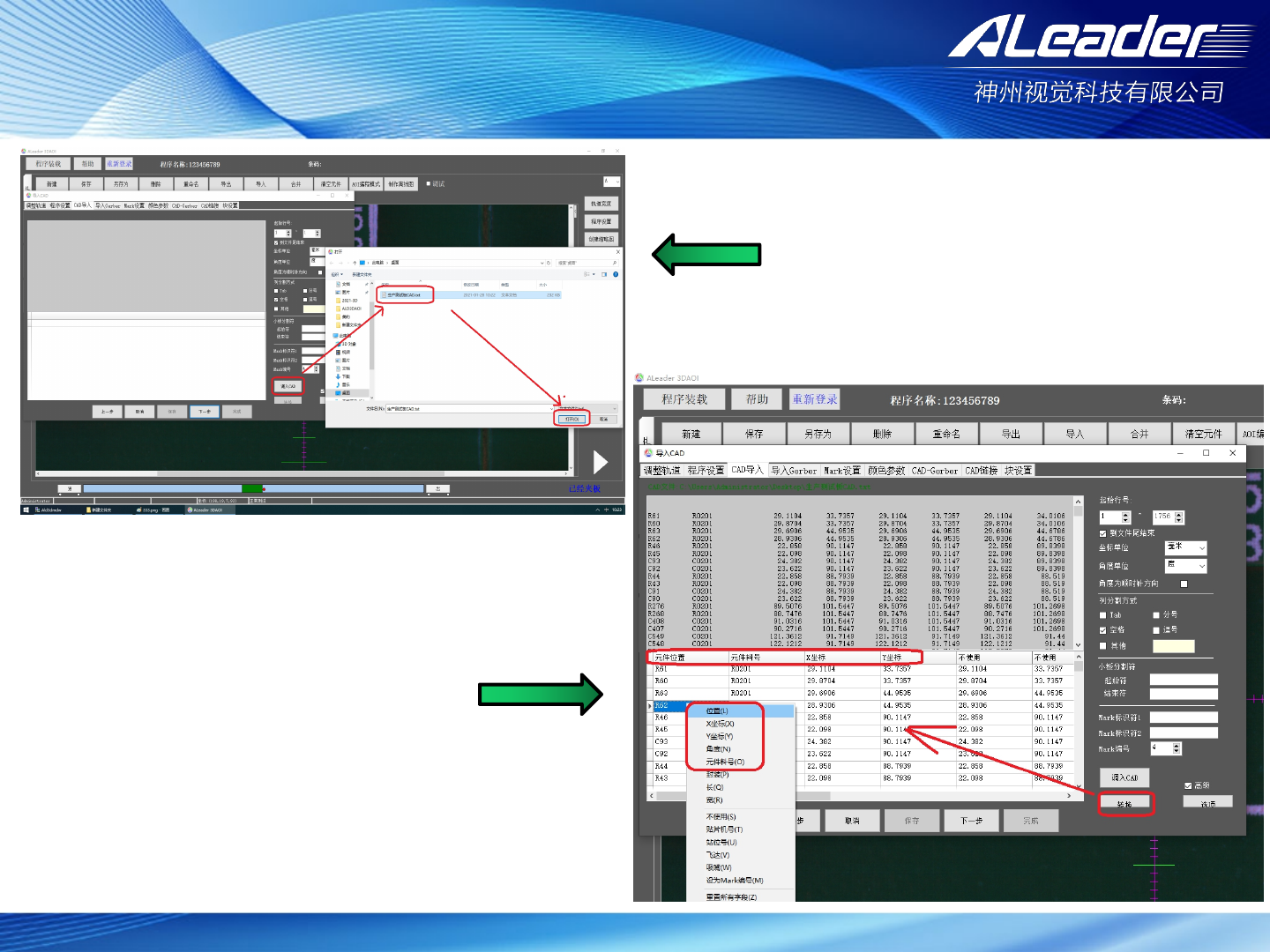 服务热线: 400-1189 -123 www .aleader .hk E-mail:aoi@aleader .hk Ø 步骤5.2:CAD导入(无坐标时该步骤可以跳过) 把CAD生成的坐标图与底板零件进行手动移动与零件大概重合,然后点击锁定 双击其中一个 小红框,镜 头会移动到 当前选中框 的位置, 如左图所示 可以看到有十 字架、元件 框、零件; 当前检测框与 零件位置有 偏差,点击 元件中心点 ,使十字 架处于零件 中心 然后点…