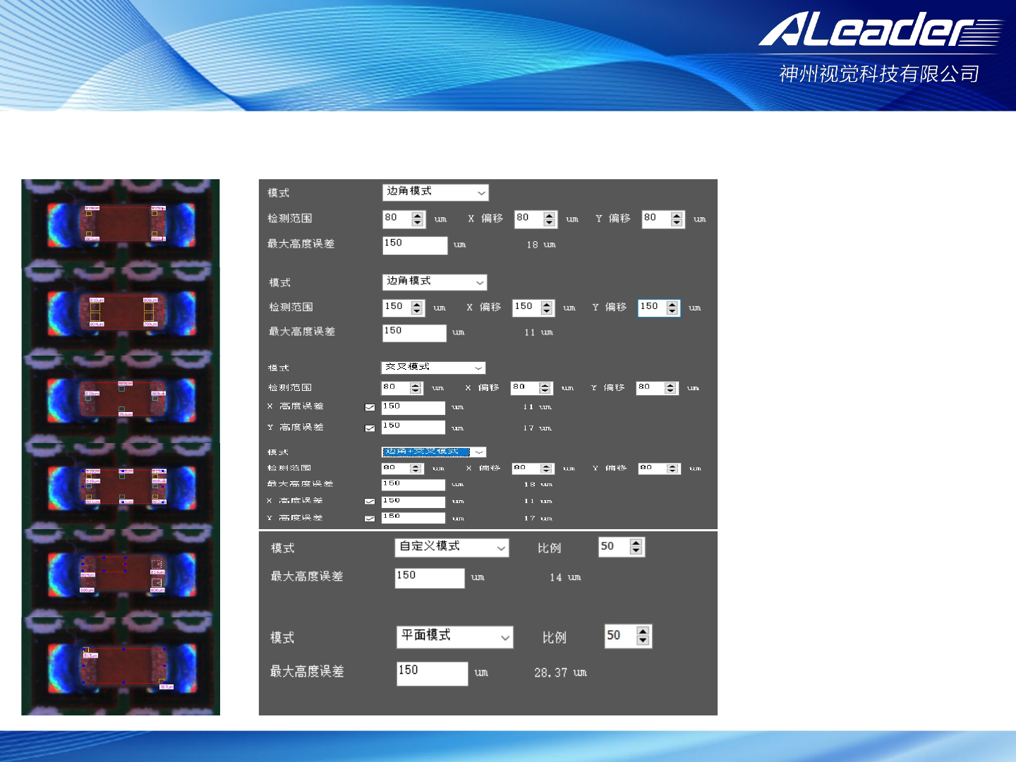 服务热线: 400-1189 -123 www .aleader .hk E-mail:aoi@aleader .hk Ø 算法:Planeness 此算法主要检 测检测区内各 个点区域的最大 高度差,拥有 不同模式,不同 模式下检测区 域不同 检测范围以 及X/Y偏移主 要用 于调整检测 区域大小及位 置