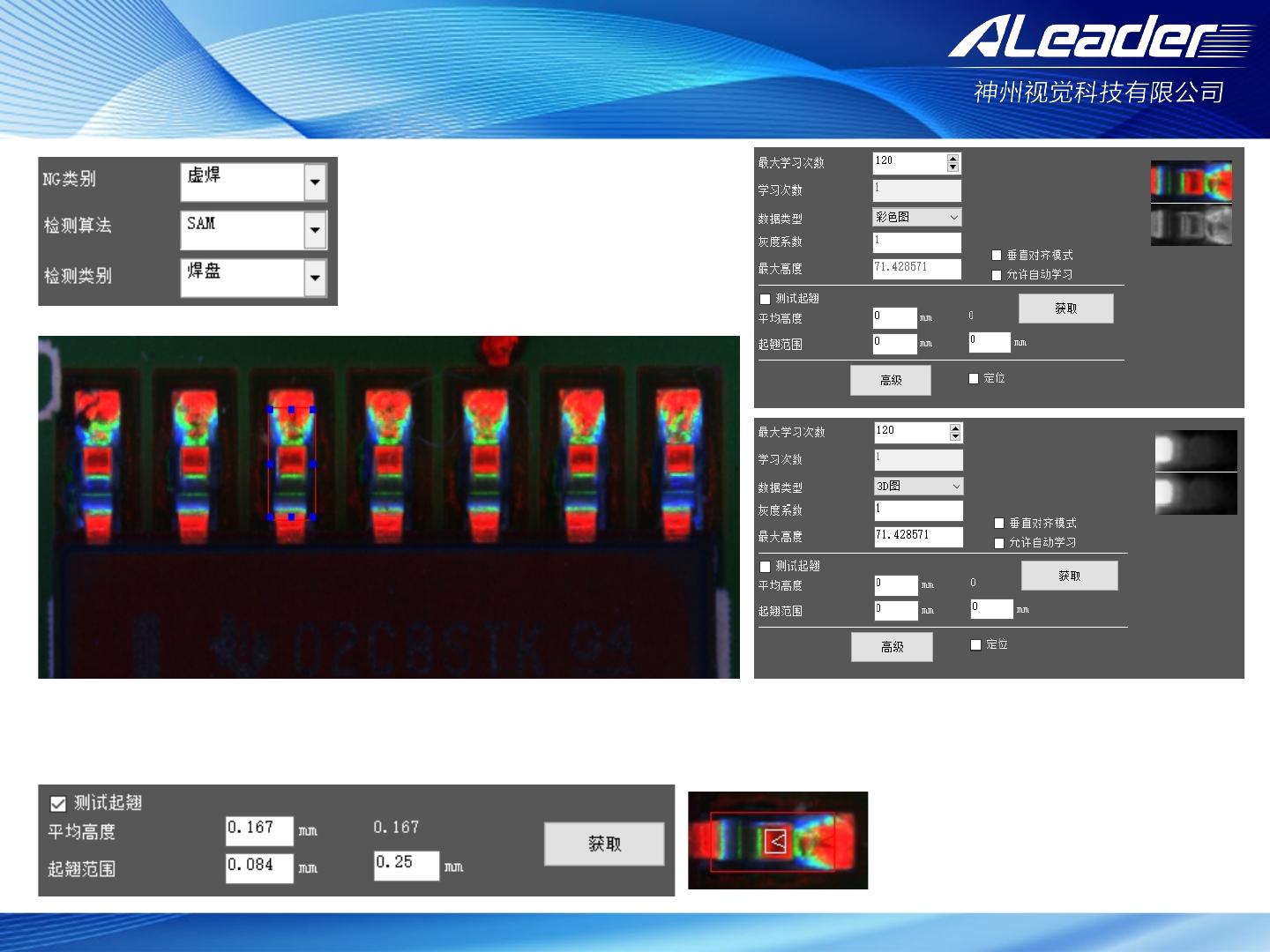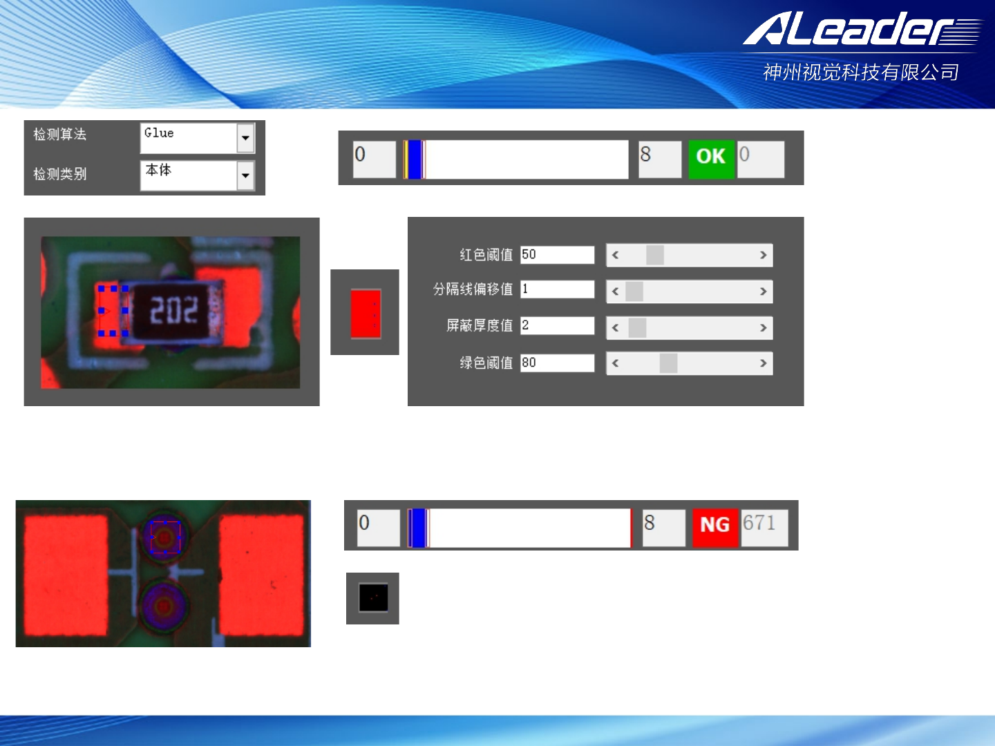 服务热线: 400-1189 -123 www .aleader .hk E-mail:aoi@aleader .hk Ø 算法:Glue 此算法为红胶 板溢胶检测 :“红色 阈值”/“绿 色阈值”用 以控制红胶 色彩 “分隔 线偏移值” /“屏蔽厚度 值”用以控 制检测区域 大小 当检测到红胶 时报警