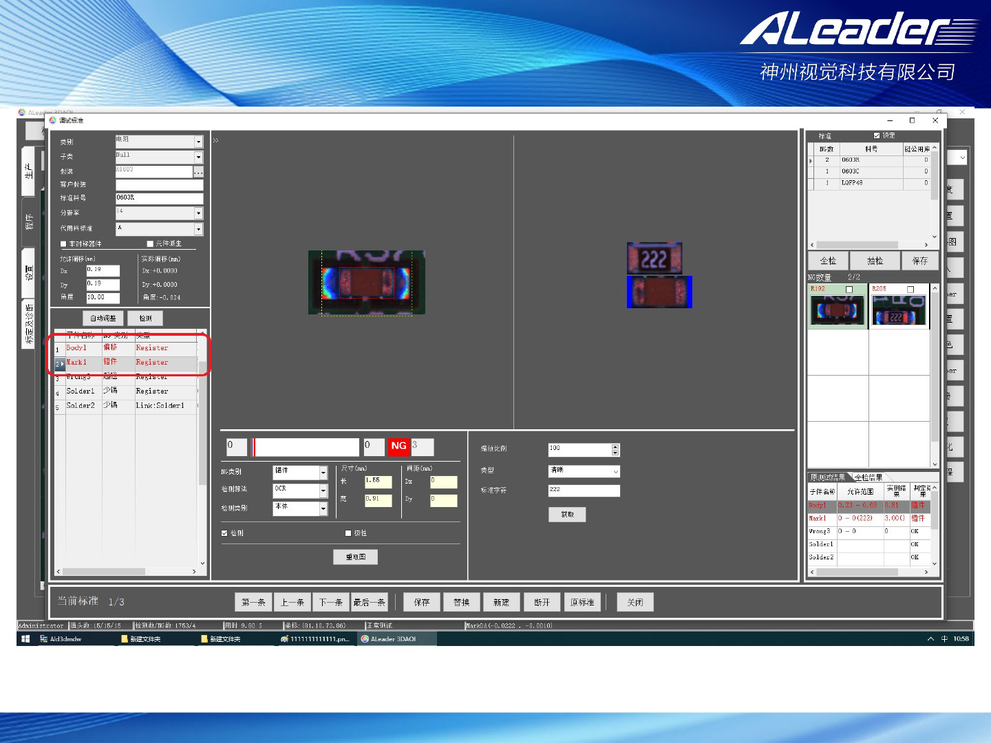 服务热线: 400-1189 -123 www .aleader .hk E-mail:aoi@aleader .hk Ø 调试界面: 当元件框有明 显偏差时 ,可以双击 该标准图片 镜头会移动到 当前物料 的位置,根 据实际情况 摆正即可