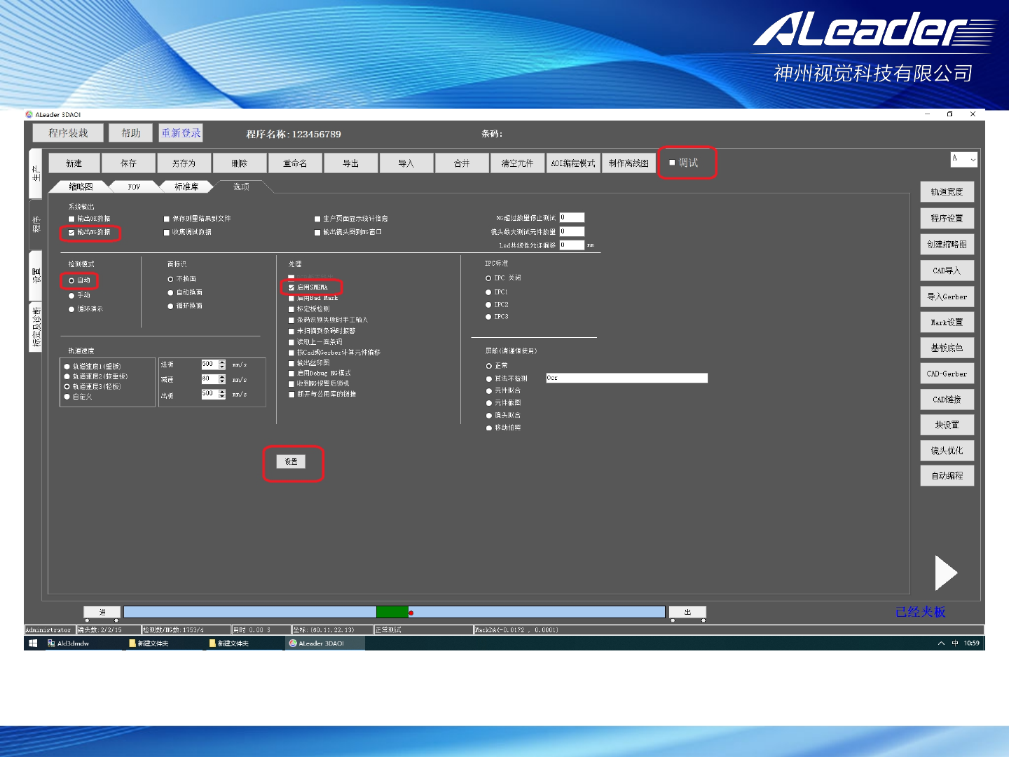 调试完成后:选择“输出NG数据”+“自动测试”+“启用SMEMA”,点击设置,最后点击右下角三角尖即可正常流线测试