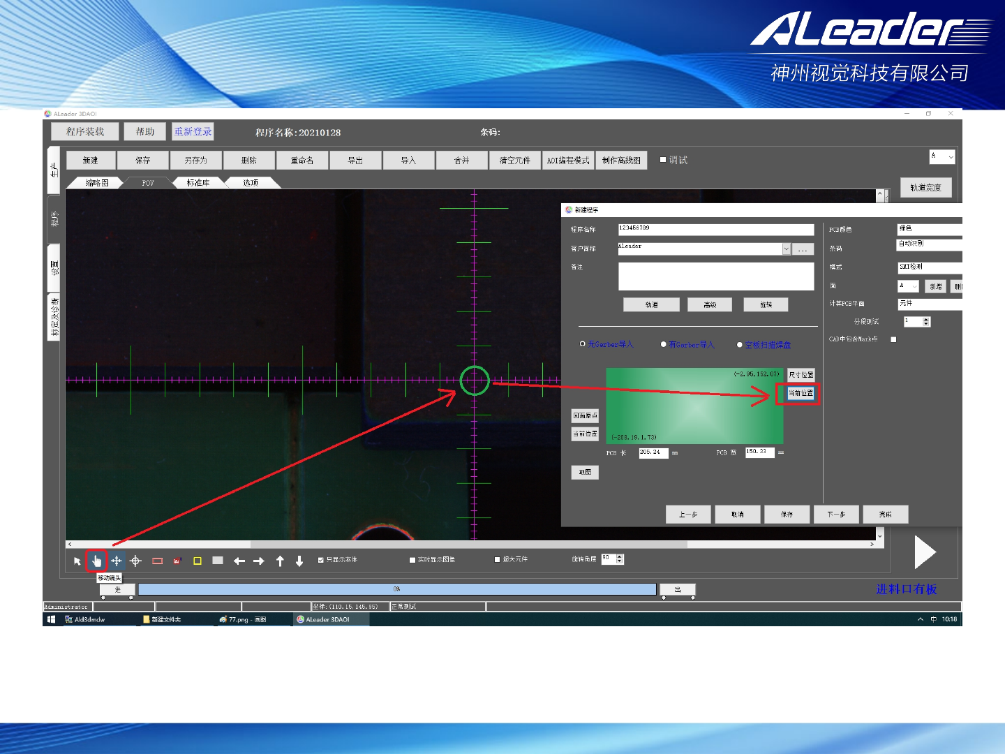 服务热线: 400-1189 -123 www .aleader .hk E-mail:aoi@aleader .hk Ø 步骤3.1:设置PCB尺寸(左下角) 选择手指图 标,移动镜头 中心,处于 板子左下 角,并点击 红框中“当 前位置”