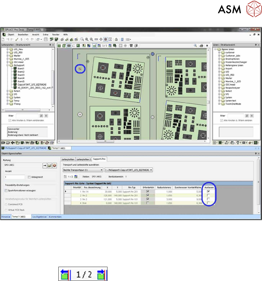 Die definierten Support-Pin-Positionen mit ihren Eigenschaften (wie Support-Pin-Typ, Erforder-