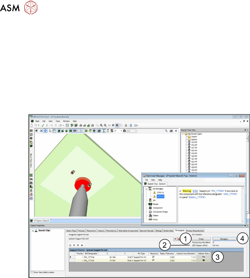 After the check, a collision status (3) is displayed for each support pin: