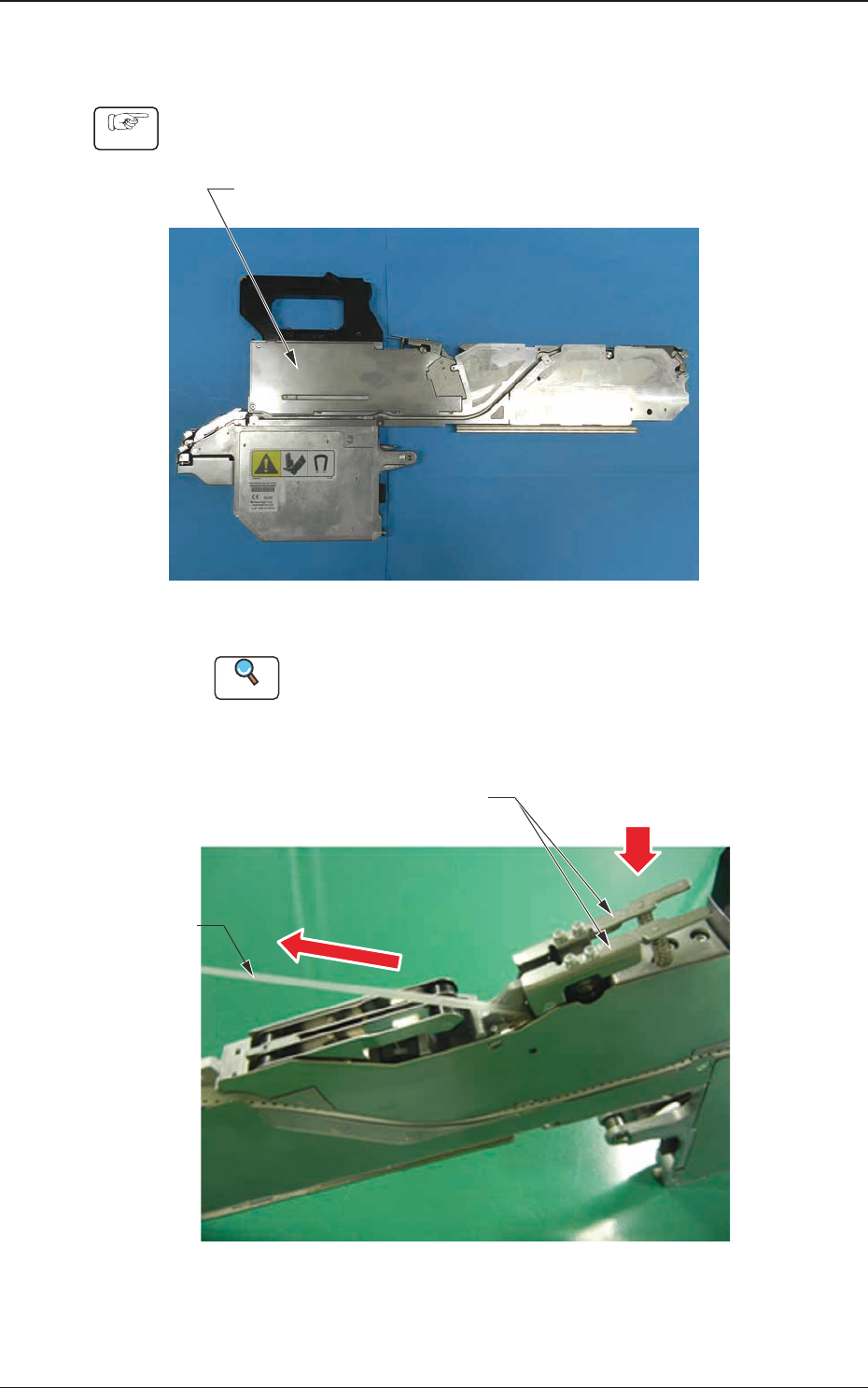 2.3 纸带及压纹带的拆卸步骤 Procedure (1) 从封口盖带收纳部拉出封口盖带。 封口盖带收纳部 Fig.B17 Reference 关于封口盖带的取出请参照 “ 2.4封口盖带的取出 ” 。 (2) 下压封口盖带上卷解除杆,拆卸封口盖带。 封口盖带上卷解除杆 封口盖带 Fig.B18 (3) 用手指轻轻按住抑制器顶端,再按下顶端钩的下部,拾起抑制器。 1209-001 2.3纸带及压纹带的拆卸步骤 …