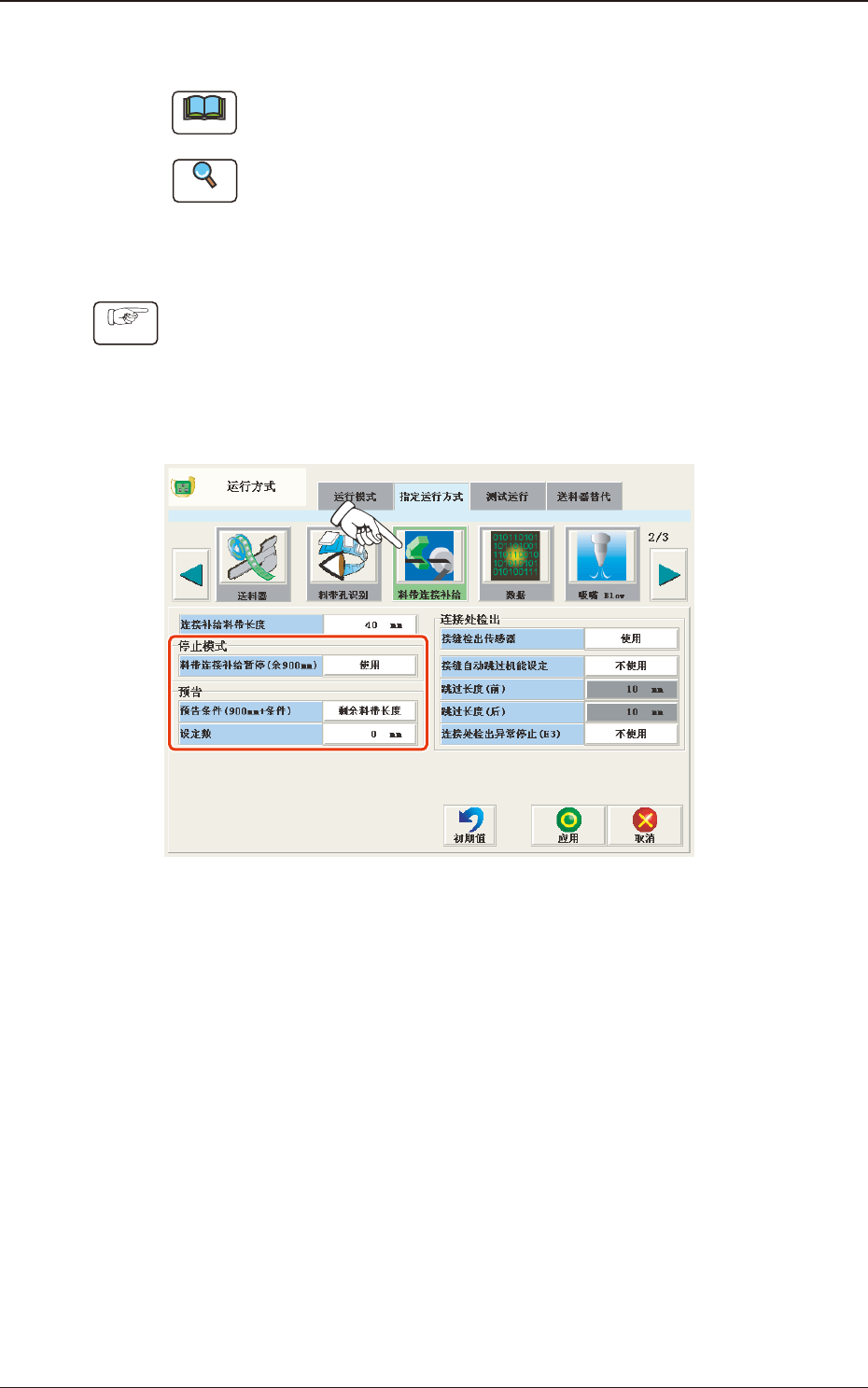 1209-001 6.2 接合前的装置主机的设定 Note 进行接合作业时,首先需要设定装置主机。 Reference 有关 “ 料带连接补给 ( 接合 ) ” 界面的说明,请参照主机使用说明书 “ 第二 卷第一章4.2.8料带连接补给 ” 章节。 6.2.1 接合停止以及预告条件的设定 Procedure (1) 按生产运行界面 的[ 指定运行方式 ] 按钮。 ( 显示 “ 指定运行方式 ” 选项卡。)…