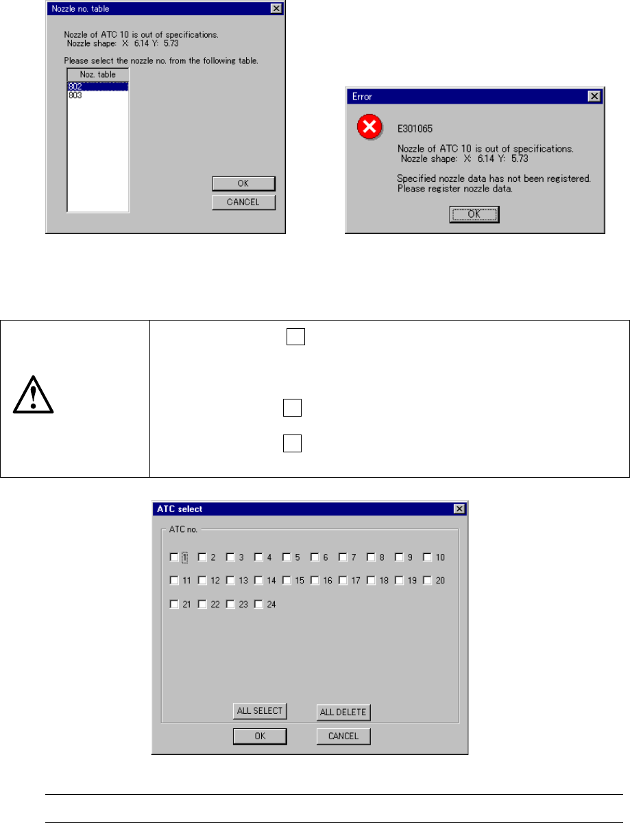 7 − 18 Figure 7.2.2. 1.2 “Registered nozzl e no. table” dial og box Figure 7.2.2. 1.3 Nozzle informatio n not-registered error dialog box CA UTION W hen you click the F3 key, the head moves to allow you to attach/detach …