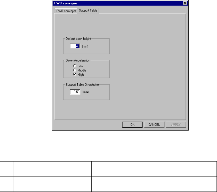 1 Default back height Sets the PWB position lower limit on the support table.