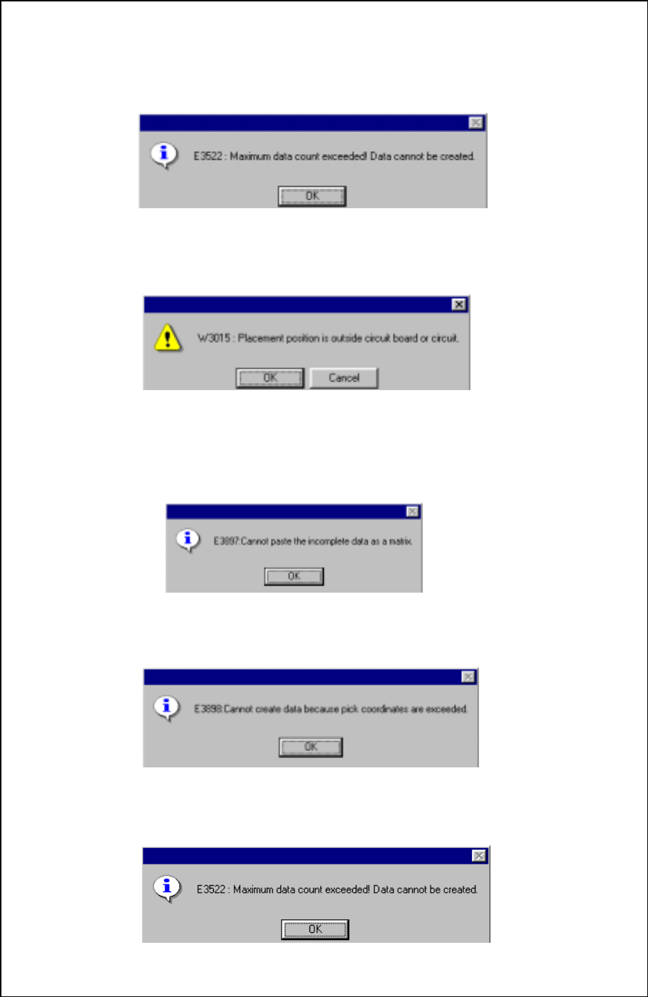 4 − 33 Example of the [ Matrix Copy] command result When this command is successfull y executed (For Placement data) Component IDs X Y Angle Component name (Screen image) R1 5.00 10.00 45.00 1608-A R2 10.00 10. 00 0.00 1…