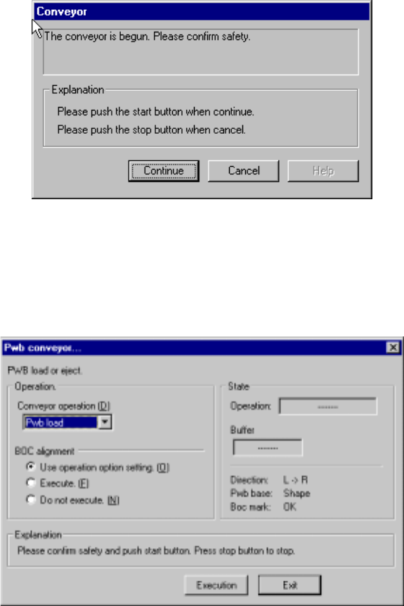 After the axis moves to the safety position, the following “Pwb conveyor” dialog box