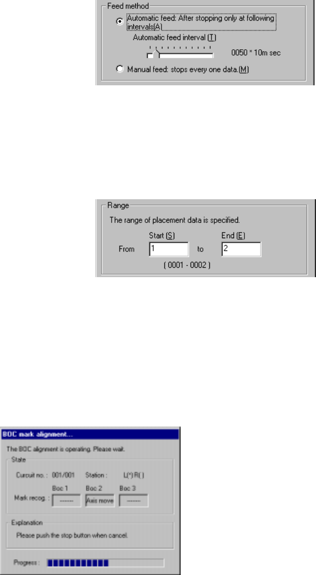 4 – 215 1) Feed method ① Automatic f eed The cam era shoots a component placement position one by one at regular intervals. The cam era stops f or t he time of period specif ied with the “Autom atic f eed interval” slide…