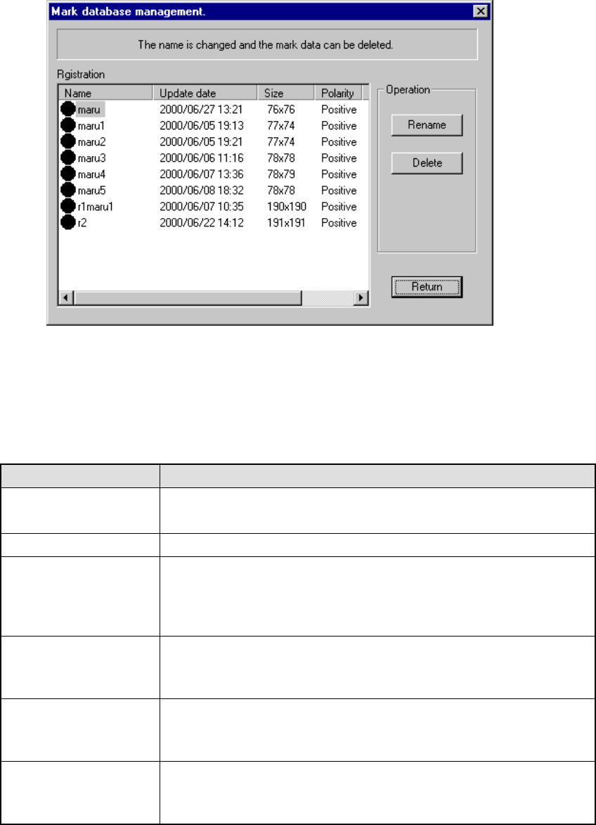This list displays the mark data registered in the database. The meaning of