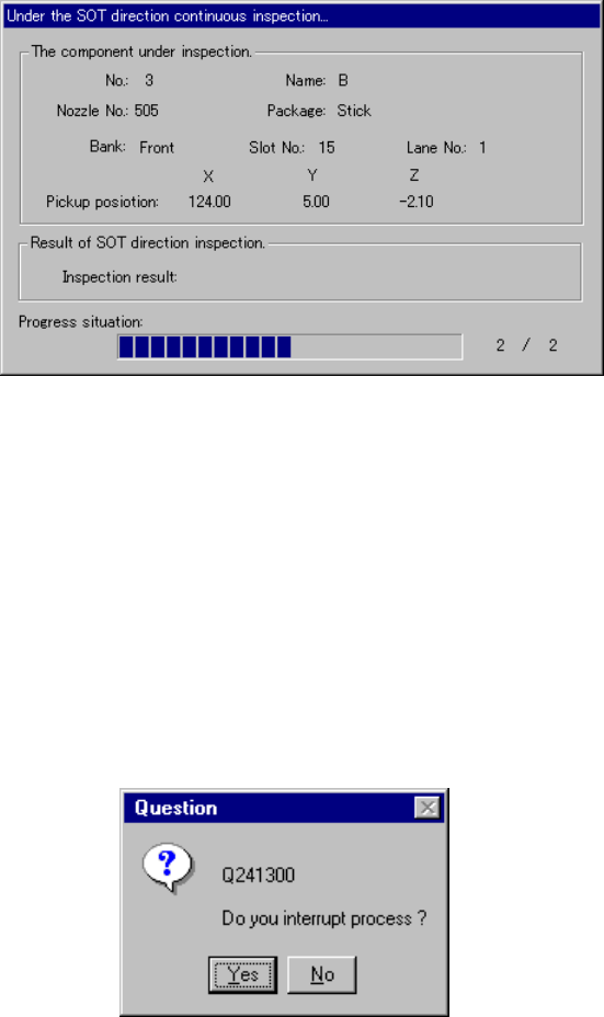 6 − 161 6.7.3.6. 5 Continuous inspecti on error dialog box If the inspection result indicates “NG” , the f ollowing dialog box appears and it allows you to enter the system to Sing le Inspection mode. Figure 6.7. 3.6.5 C…