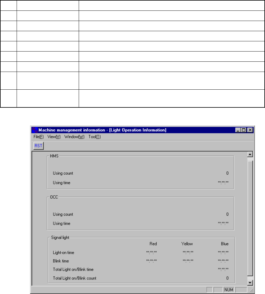 5 Light-on time Displays the total time each signal light (red, yellow and blue) lit.