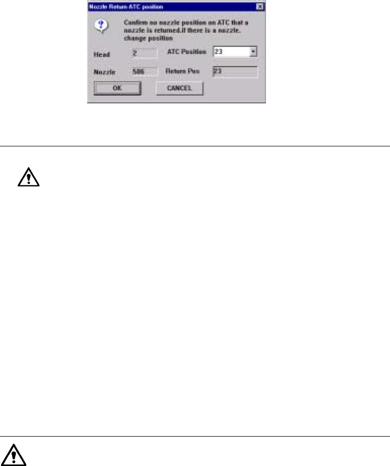 9 − 23 − Ret urn the nozzle attached on the head t o the ATC on t his screen. Figure 9.5.1.2 “Nozzle On Head Information” screen − T here are t wo way s f or ret urning a nozzle to the AT C: “Sem i-Auto Nozzle Returning …