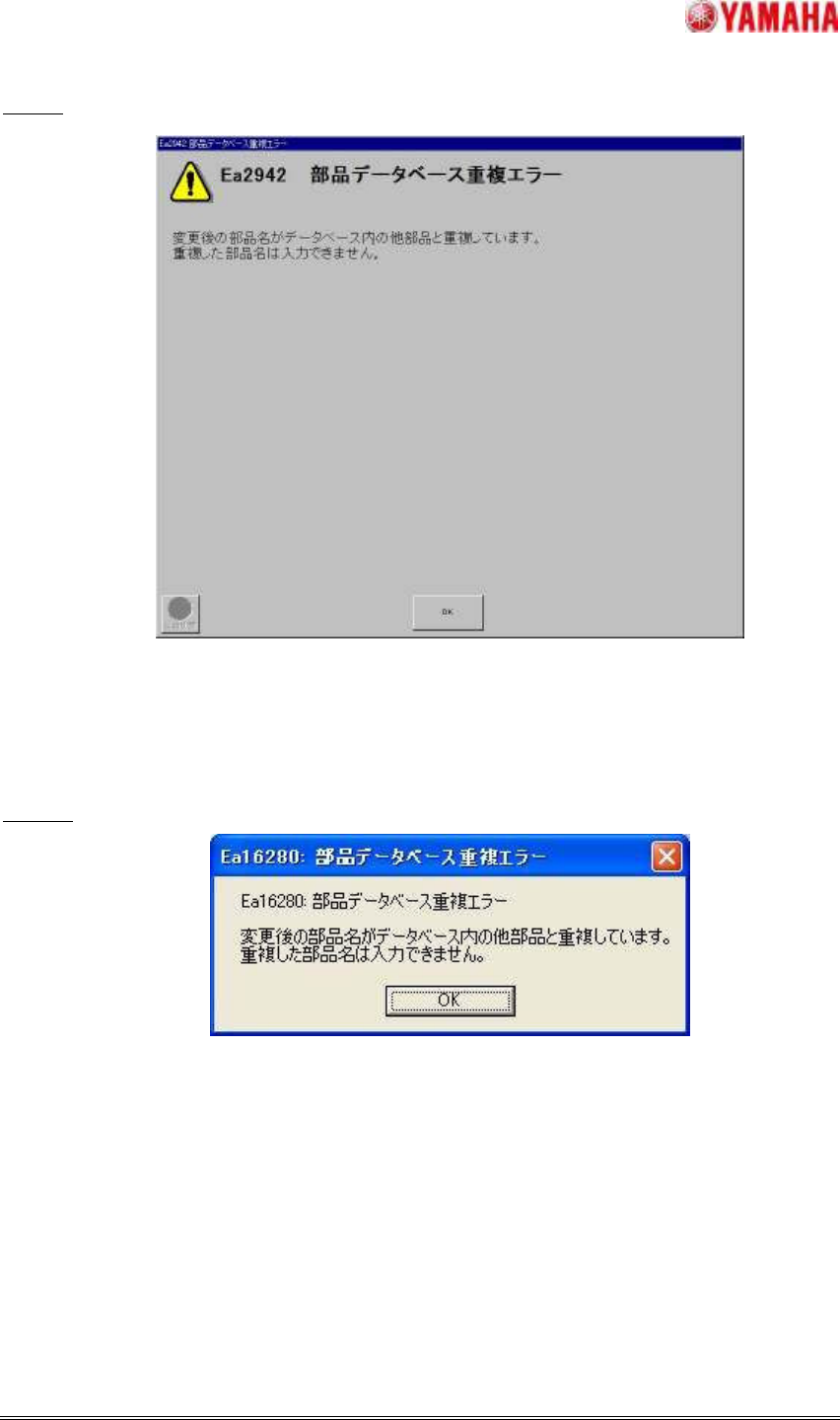 ヤマハ発動機株式会社 I M 事業部 マウンター技術部 ソフト開発グループ MD OC- SOFT50046 8/12 Ea29 42 Ea29 42 Ea29 42 Ea29 42 マシン、マシンエディタ [原因] デ ータベース一覧 で部品名、 コメント(判別キー) を変更し、他 の部品と重複し た。 [対策] 他の部 品と重複し ない部品名、 コメントを入力し てくだ…