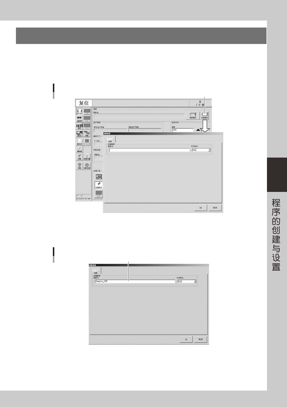 4-1 4 1. 创建程序 创建基板程序,必须先登录基板名。按照下列步骤登录基板名。 1 按生产设计画面的 [ 创建基板 ] 按钮。 打开“创建基板”对话框。 [创建基板]按钮 “创建基板”对话框 66400-L3-00 2 在基板名输入框中输入基板名。 以半角英文数字输入 20 字符以内的基板名。不可输入下划线 (_) 以外的符号和空格。 输入基板名 输入基板名 66401-L3-00