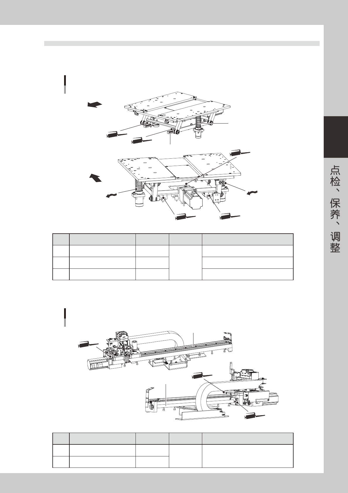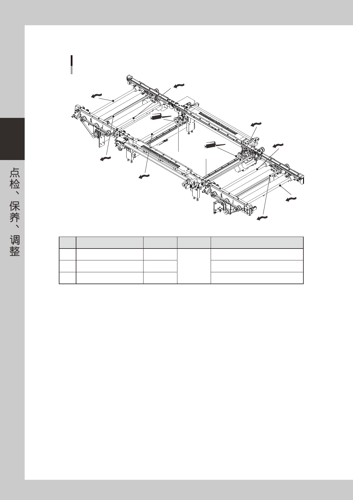 8-16 8 3.3.3 W 轴 ( 自动调节传送宽度 ) W轴(自动调节传送宽度) W2轴导轨 1 1 2 2 2 2 3 3 2 2 65809-L3-00 加油部位 加油位置 频率 加油方法 1 W2 轴导轨 4 每月 润滑油枪 2 各 W 轴滚珠丝杆 1 润滑油枪 3 W1 、 W3 轴六角轴 2 用手涂抹