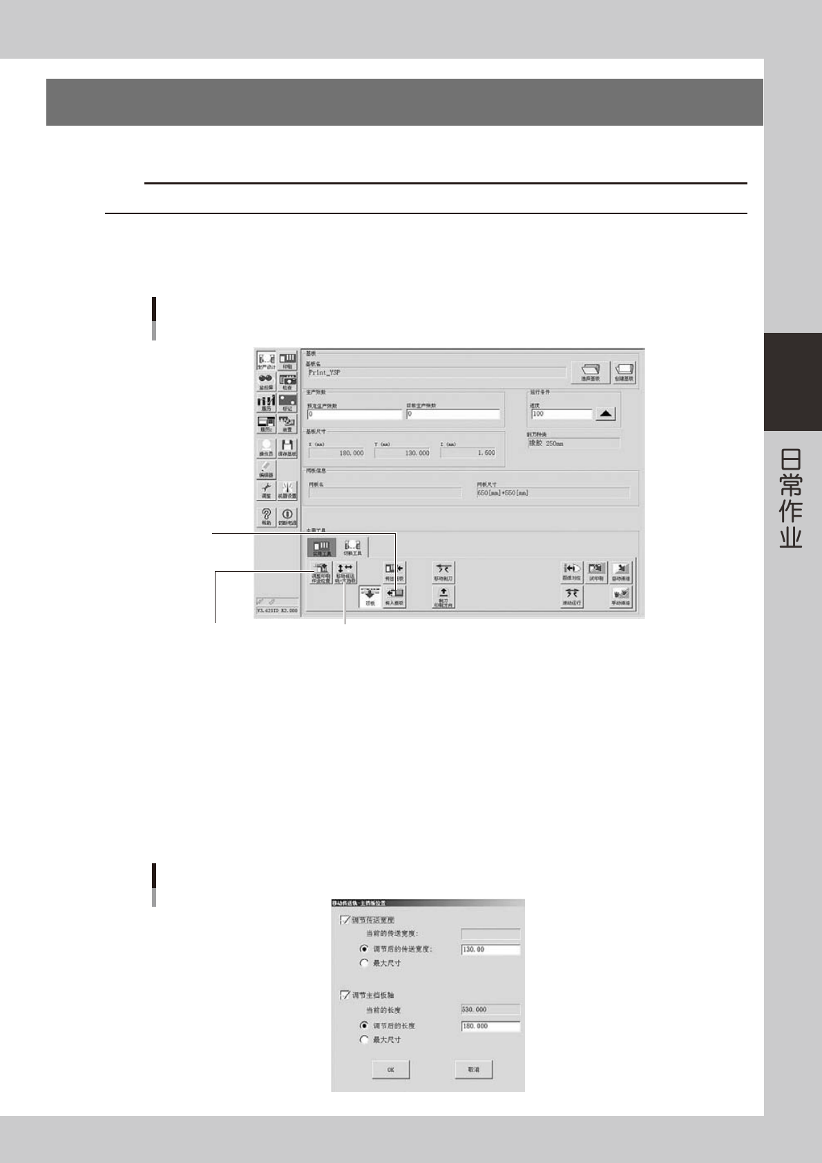 如果想要生产与前次不同的基板时,必须调节传送装置 ( 如果生产与前次相同的基板时,可省略此步骤 )。