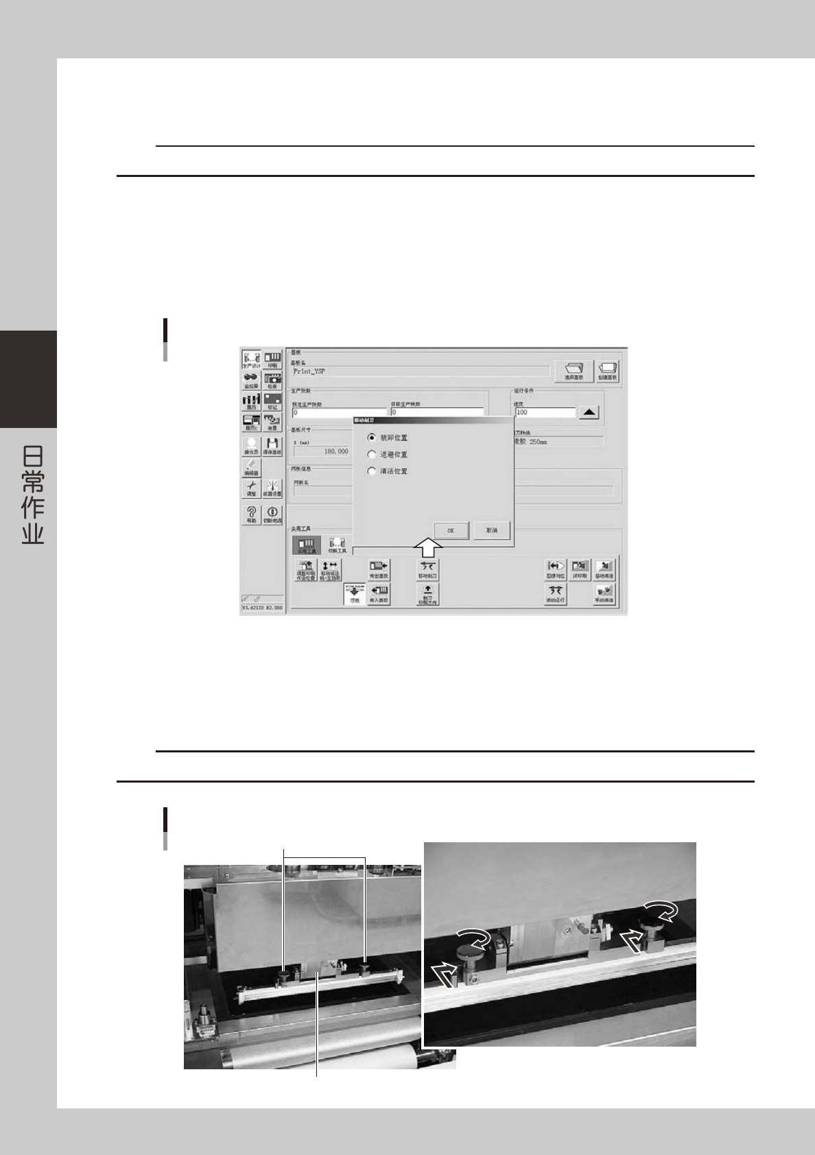 3-9 3 5.1 使用网板连接器时 如果安装尺寸为 600×550 或 550×650 的网板时,必须使用专用的网板连接器 ( 选配 )。 下面,介绍在网板托板的左右安装网板连接器的方法。 网板连接器 左侧用 右侧用 65304-L3-00 e 1 按下紧急停机按钮之后,打开上部机门与正面面板。 2 将刮刀头移到里侧。 使用刮刀头右侧的把手将刮刀头移到方便安装网板的位置。 3 将网板连接器插入指定的位置。 1. 如下图所示,在网板托板…