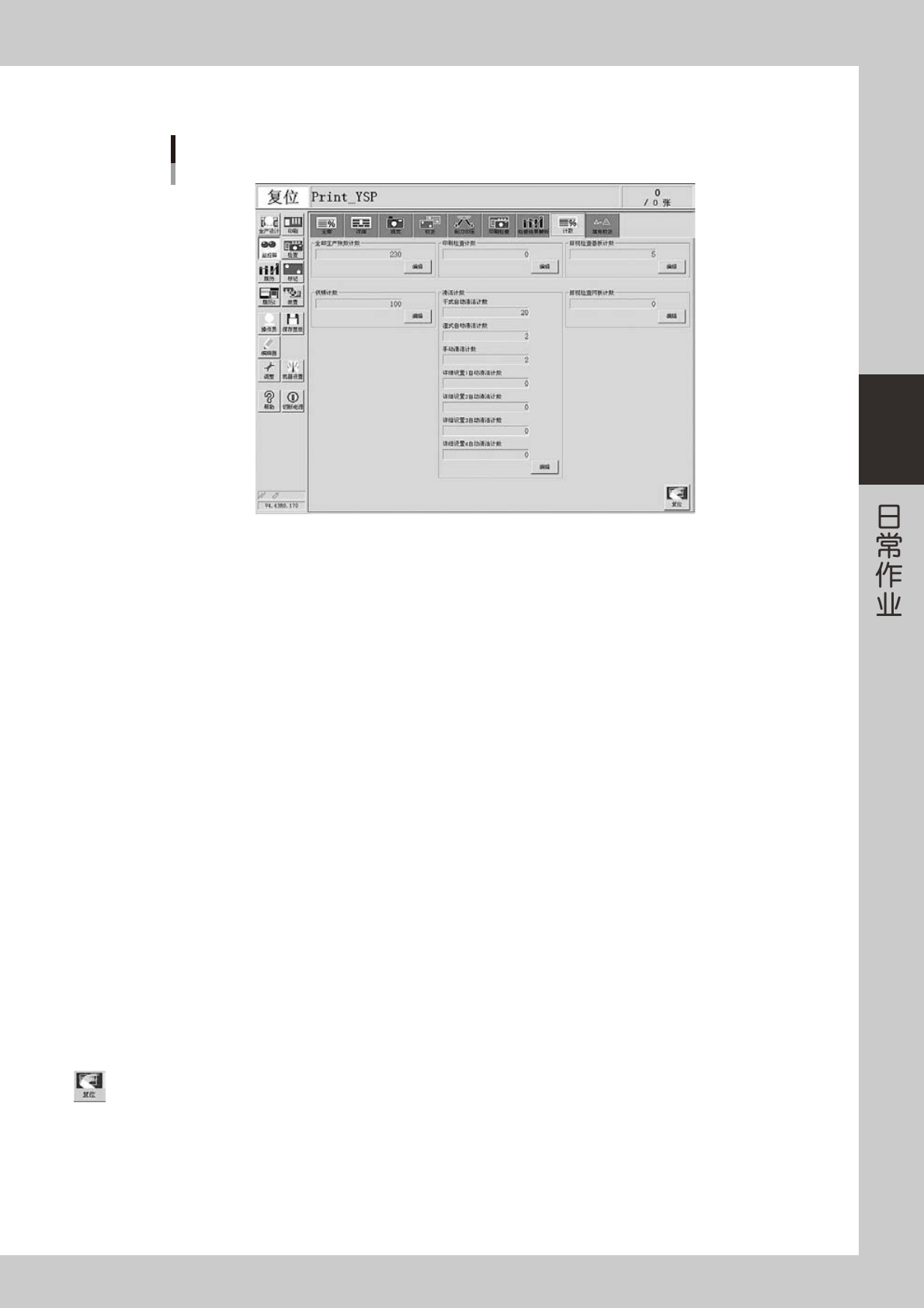 视检查网板,印刷机会暂时停机。按 [ 编辑 ] 按钮,可更改计数的起始数值。