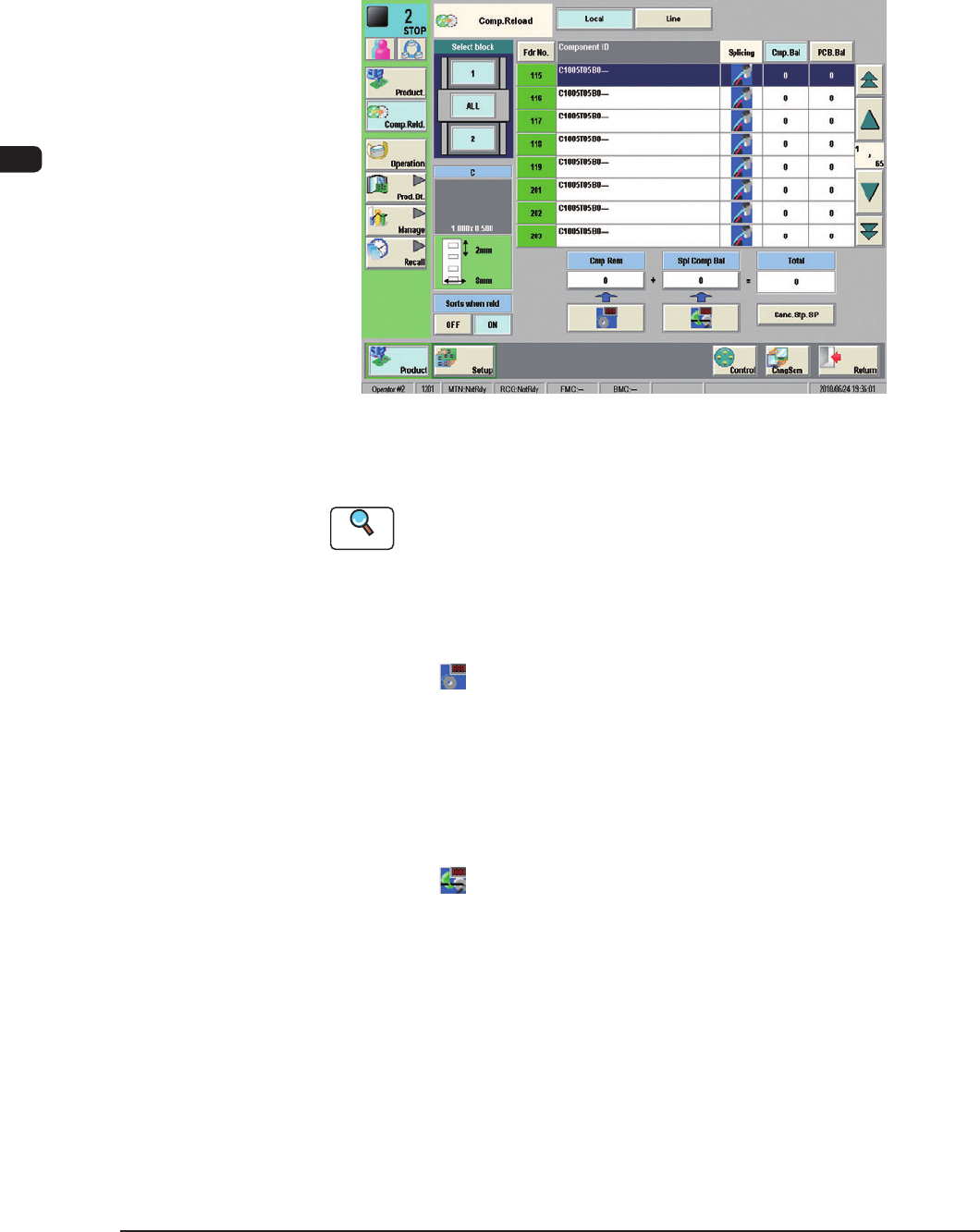 1OM-1603 3-40 3. Component Replenishment : Chap.3 (3) Press the "Fdr . No." button which corresponds to the feeder No. (FDR. No. to be set ready for splicing) displayed in the "Machine Information (Alarm f…