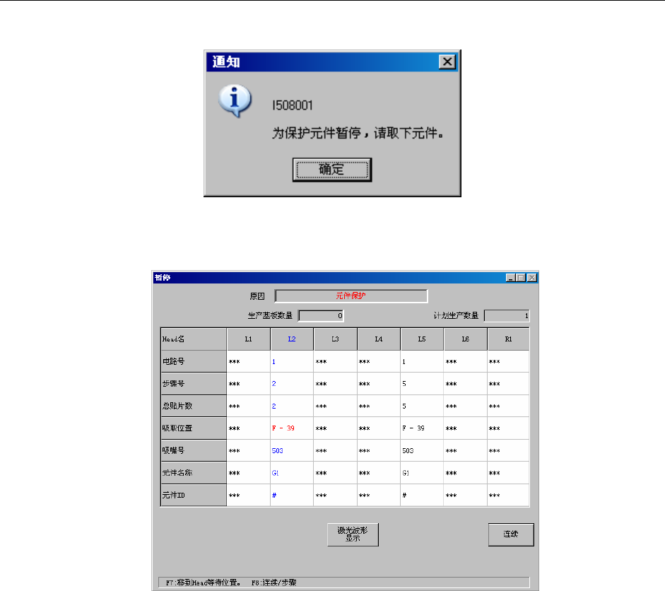 暂停的原因为激光脏污错误、芯片直立错误、激光识别错误、异类元件错误时,会显示出
