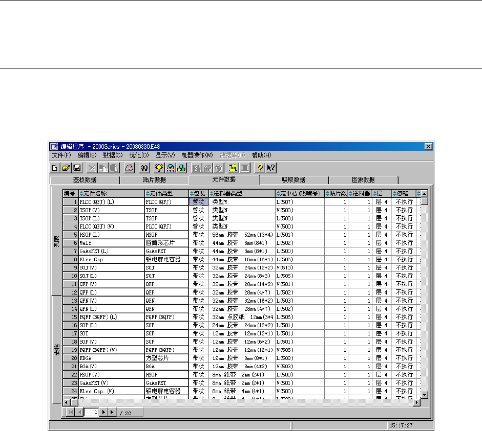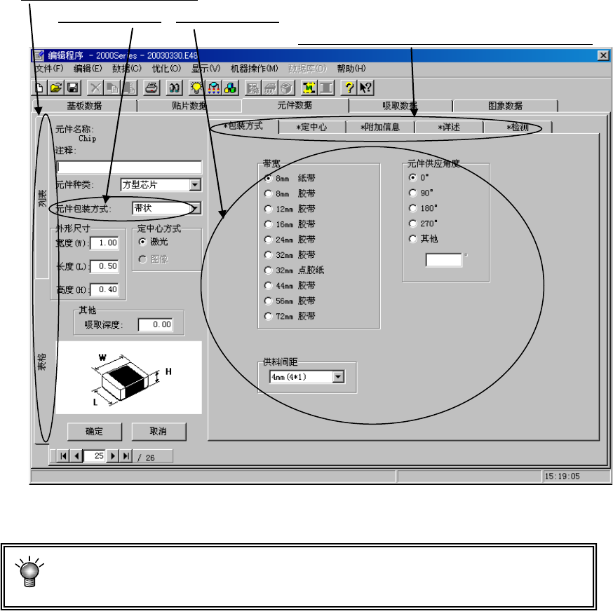第 1 部 基本篇 第 4 章 制作生产程序 从列表画面中选择 元件名 ( 双击 ) 后,将显示所选择 元件数据的表 格画面,此时,可进 行元件 数据的制作和编 辑。 表格显示 画面由基本部 分与包装方 式、定中心、附加 信息、详述、 检查部分构成, 1 个元件数 据显示为 一个画面。 表格与列表画面 的切换标签 如选择包装方式 , 则显 示该项目。 此处的选择项目 的内容显示在下面的 区域内。 图 4-3-5-1-2 元件数 据表格画…